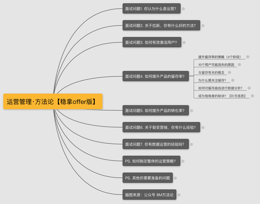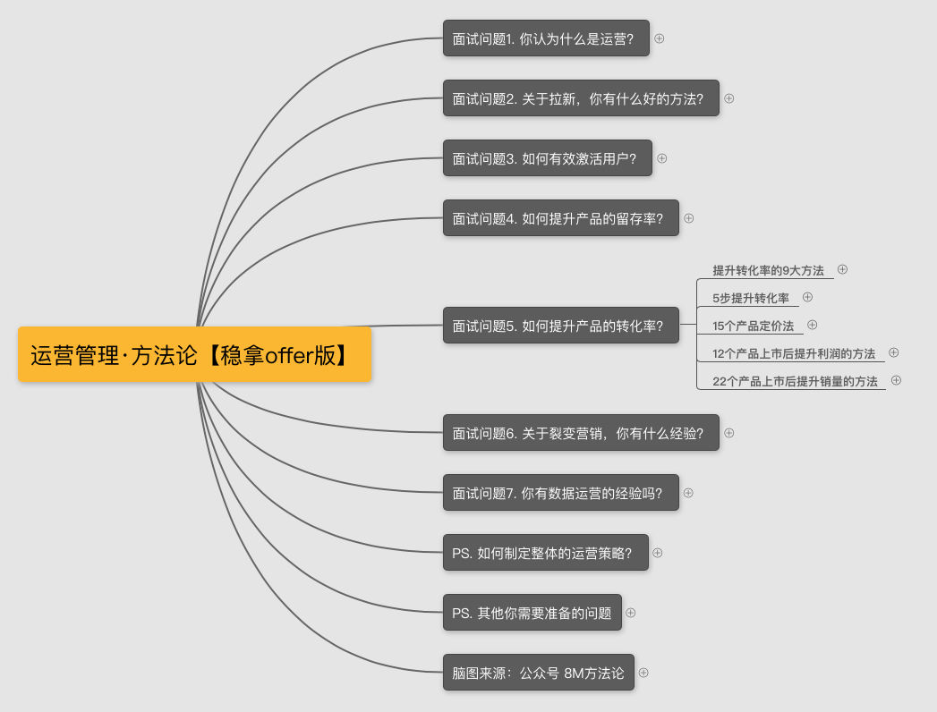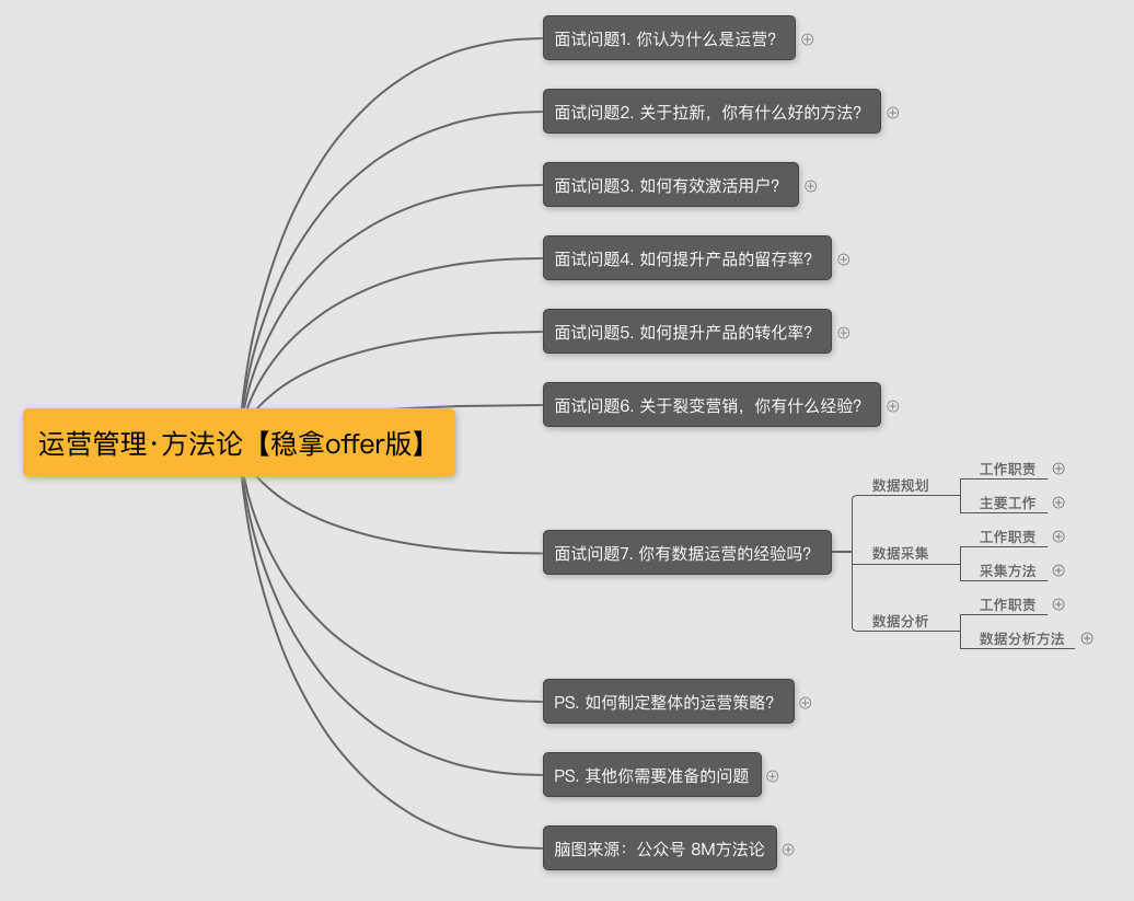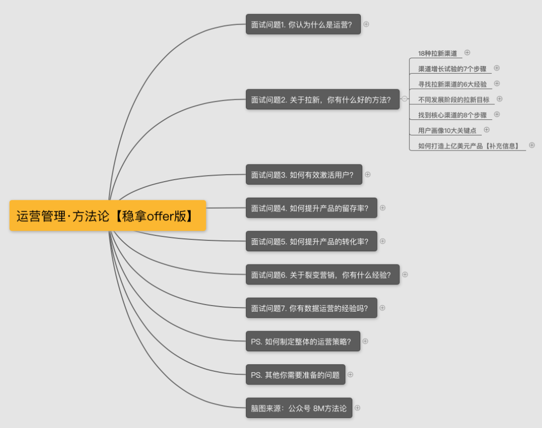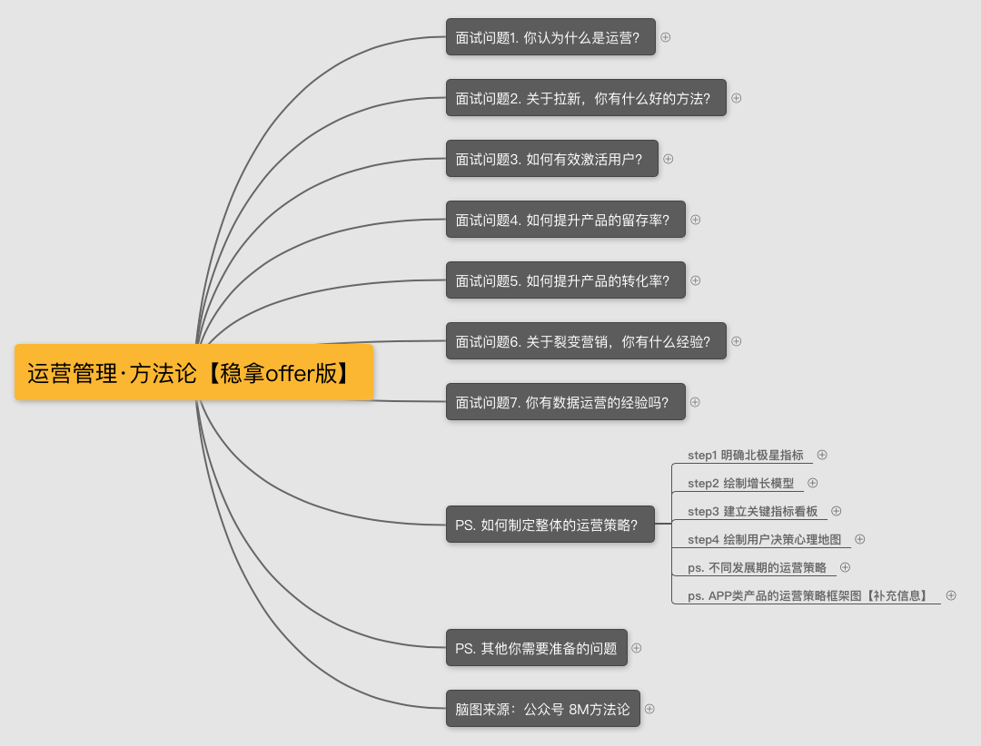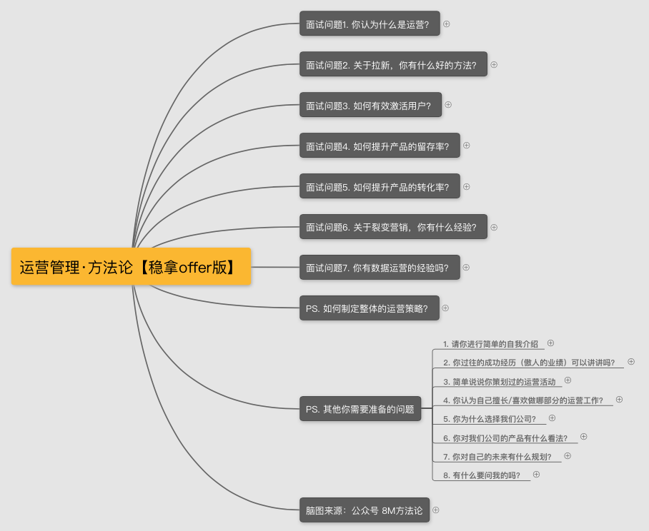 除了与岗位职责有关的问题以外,面试官还会问一些关于大运营的问题,和关于你个人的问题。具体的内容见脑图,我在这里就不赘述了。