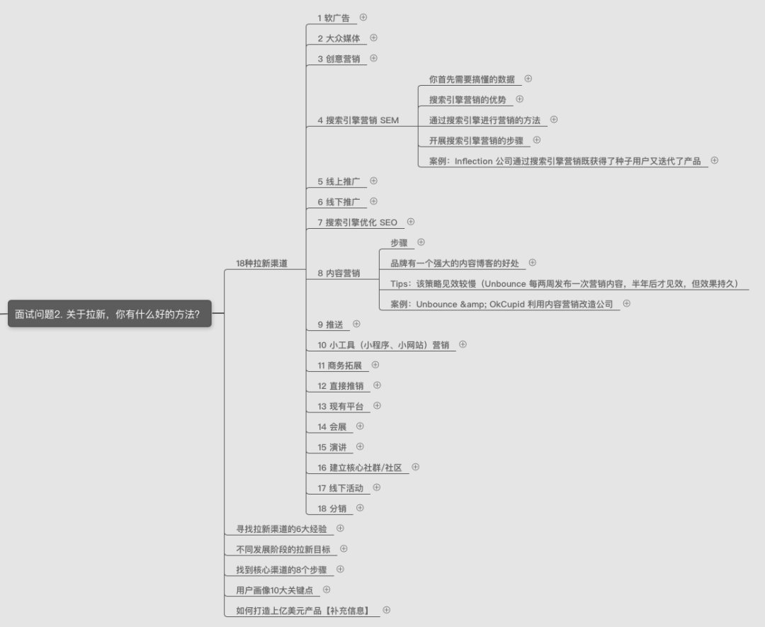 (此处回答的获客渠道,最好满足三点:1 符合你的过往经验;2 的确具有实际运营业绩,业绩不出众并无大碍,重在方法;3 应聘公司产品也能用得到的渠道。具体选择哪个渠道,可参考脑图中列举的18种拉新渠道。