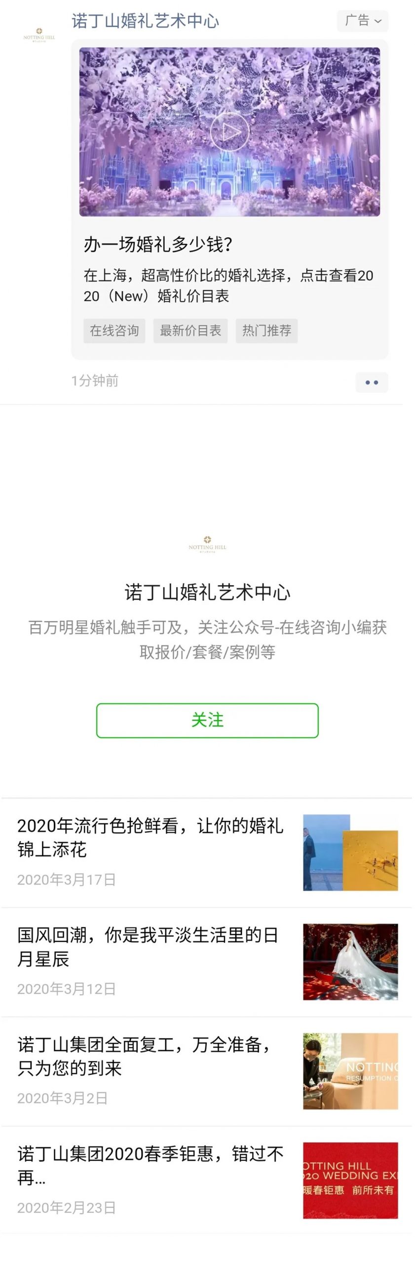 在广告的拓展之路上,诺丁山也不断寻求新的突破,为业务发展注入源源不断动力。从2017年开始,诺丁山就通过亦芯服务团队投放朋友圈广告,突破了传统婚庆企业主要投放线下广告及圈层广告的惯例,并取得了良好的效果。诺丁山也因此成为率先入局朋友圈广告的婚庆企业之一。