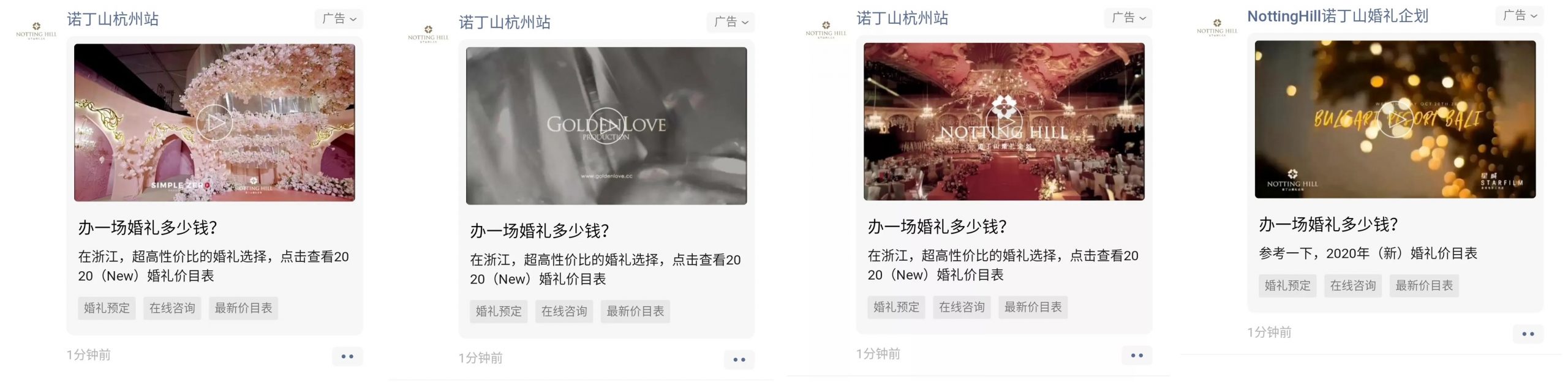 2、紧跟用户需求 精选三大标签立足于用户需求点,选择3个不同的婚礼相关标签词汇呈现在广告外层:① “最新价目表”:承载用户对报价的关注② “在线咨询”:明确转化路径,有效引导潜在意向用户关注③ “热门推荐”:表示通过点击,则可获得更多婚礼风格推荐,而不局限于当前广告视频,最大化覆盖不同偏好人群3、巧用“视频”玩转视觉营销以不同的婚礼布置风格为基准,诺丁山打造了“欧式复古婚礼“,”温馨韩流婚礼“,”梦幻婚礼“,”外景森系婚礼“等多支视频广告。