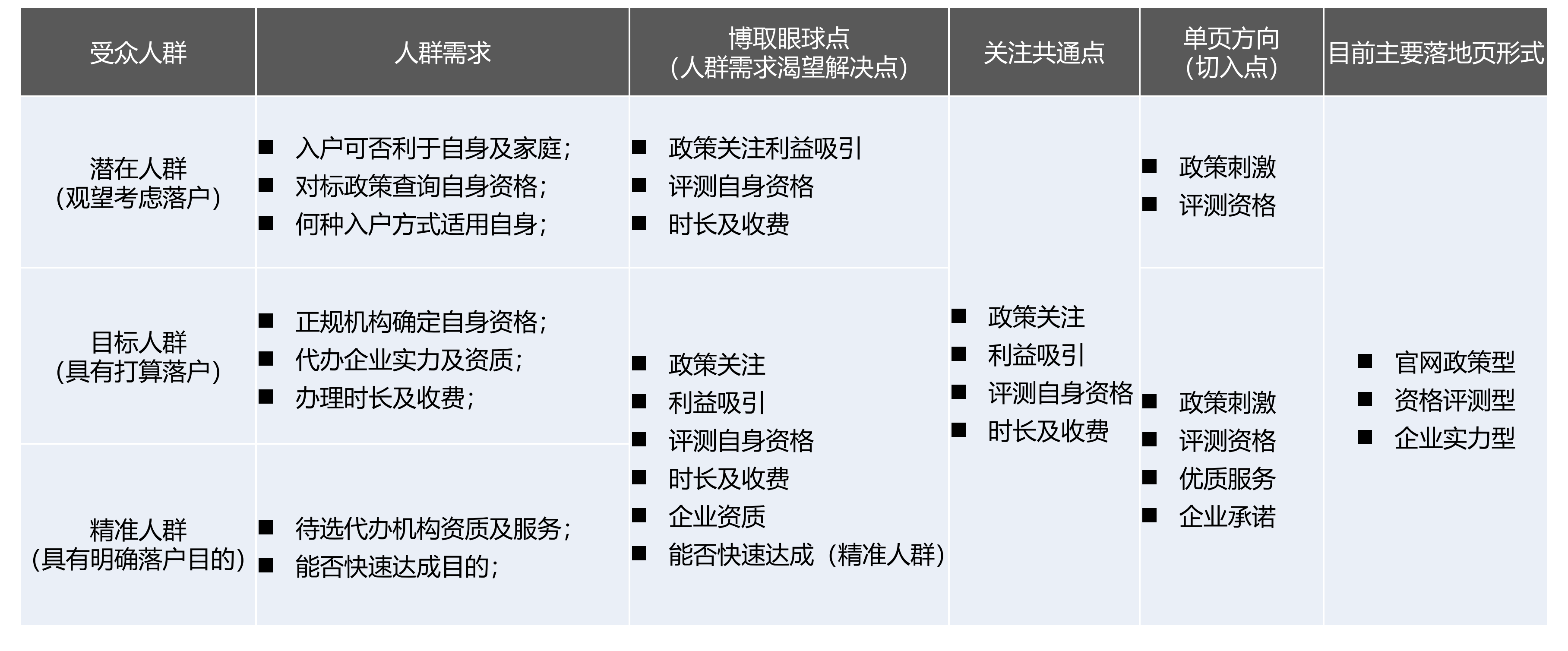 精准人群:精准人群与目标人群他们的共通点是政策关注,利益吸引、测评、流程时长以及收费。唯一不同的是,该类人群考虑到的是效率及服务质量。是否能快速达成目的,属于已明确落户的人群。