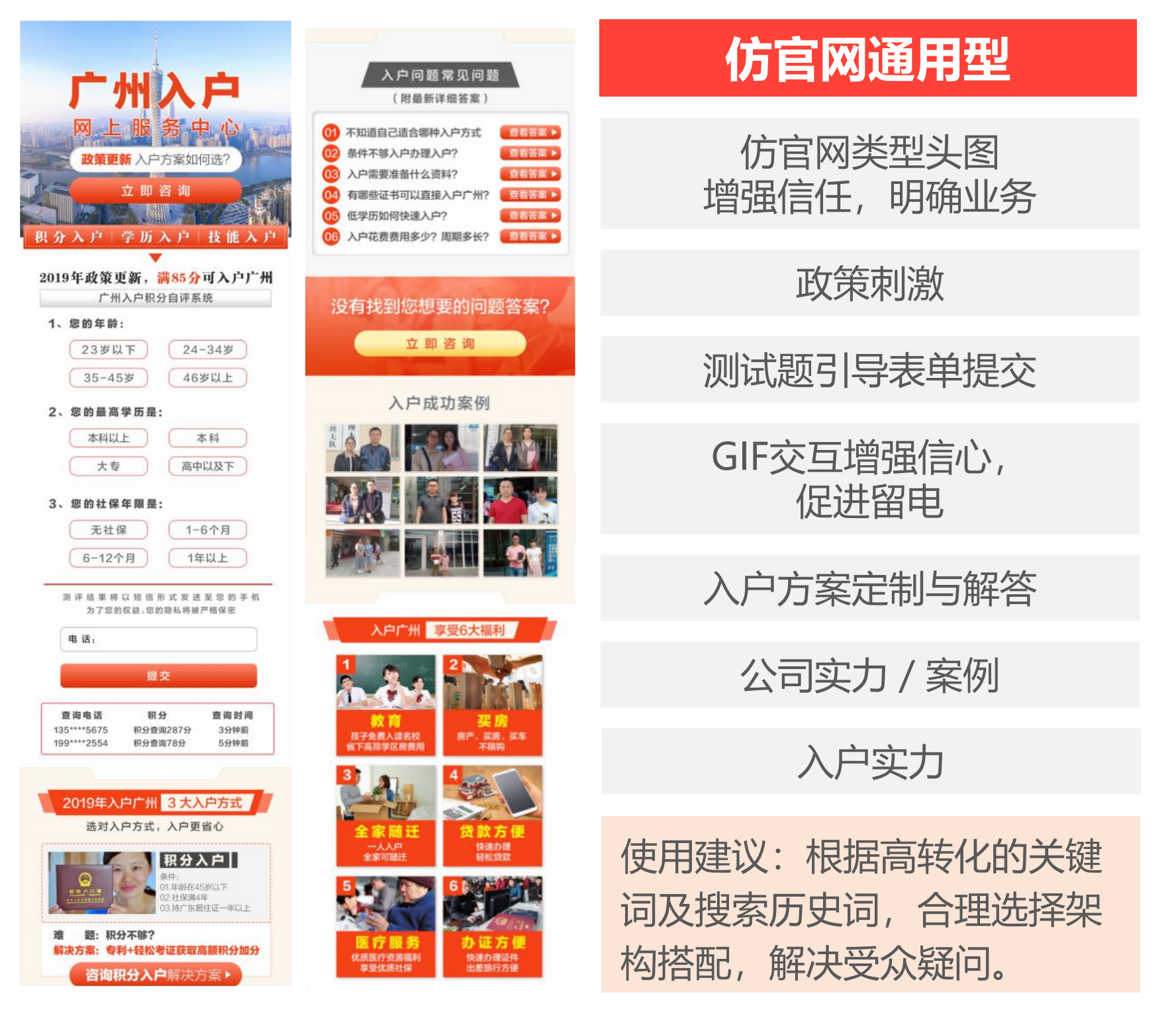 2019年,发改委发布了要解决促进约1个亿农业转移人口落户城镇的问题,通常通过积分入户,学历入户,技能入户,职称入户,应届生入户等方式入户解决,从政策和丰富的入户方式来看,造就了强大的行业发展潜力和新增大量的需求人群,对此,如何做好策略途径的引导并对落地页进行设想和搭建呢?