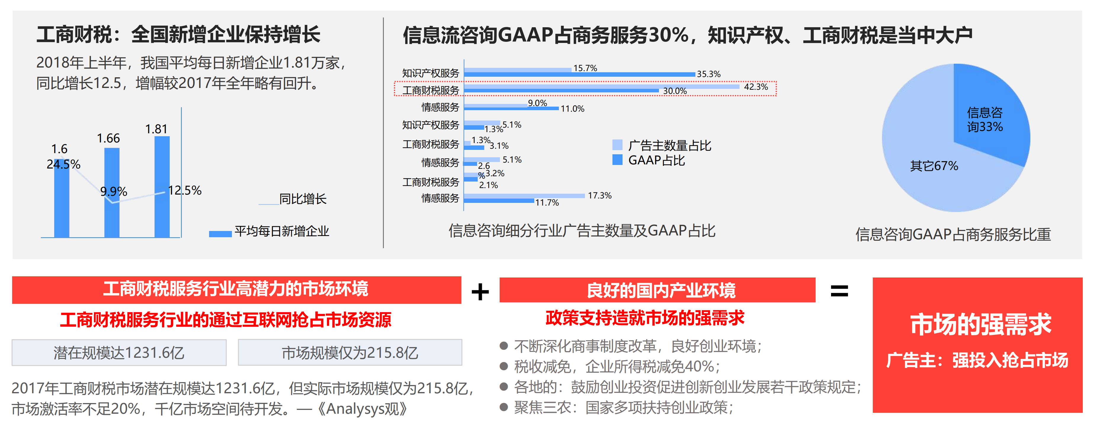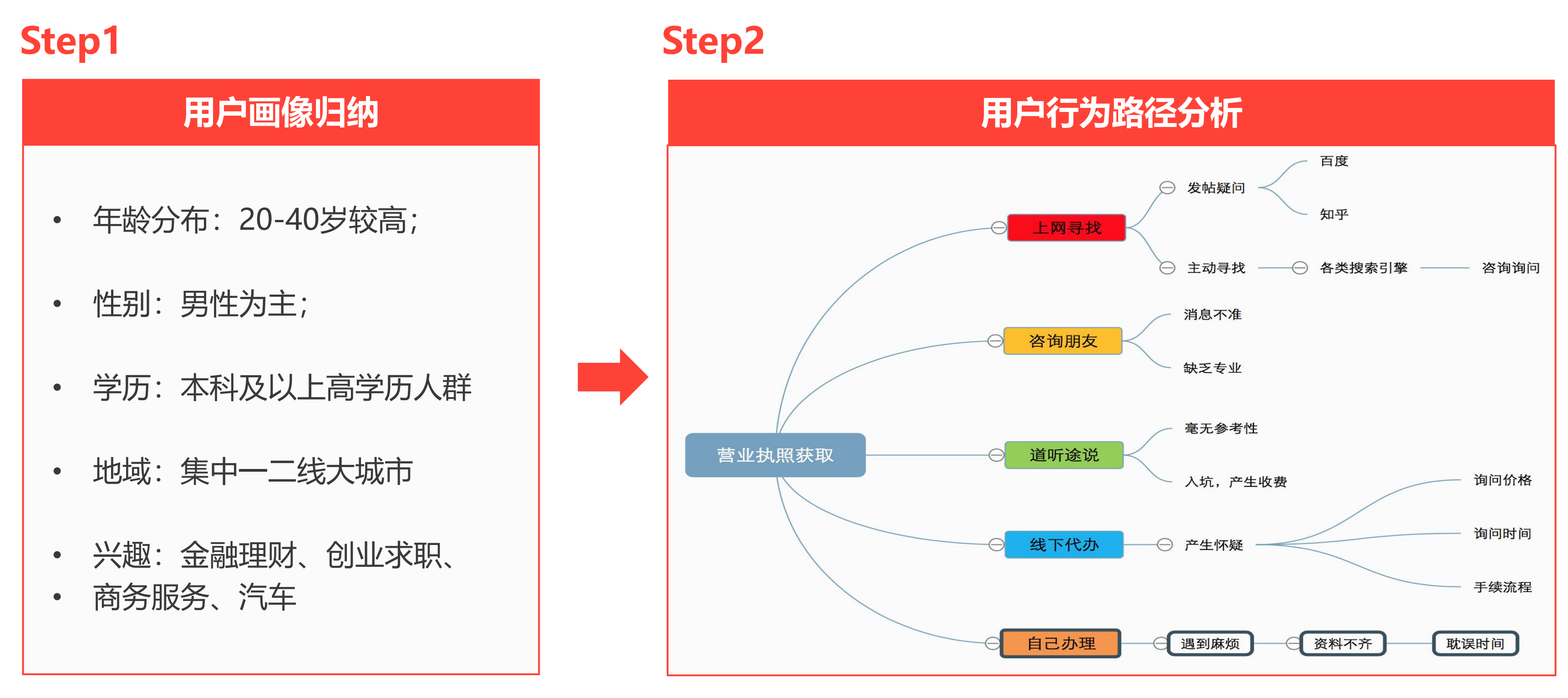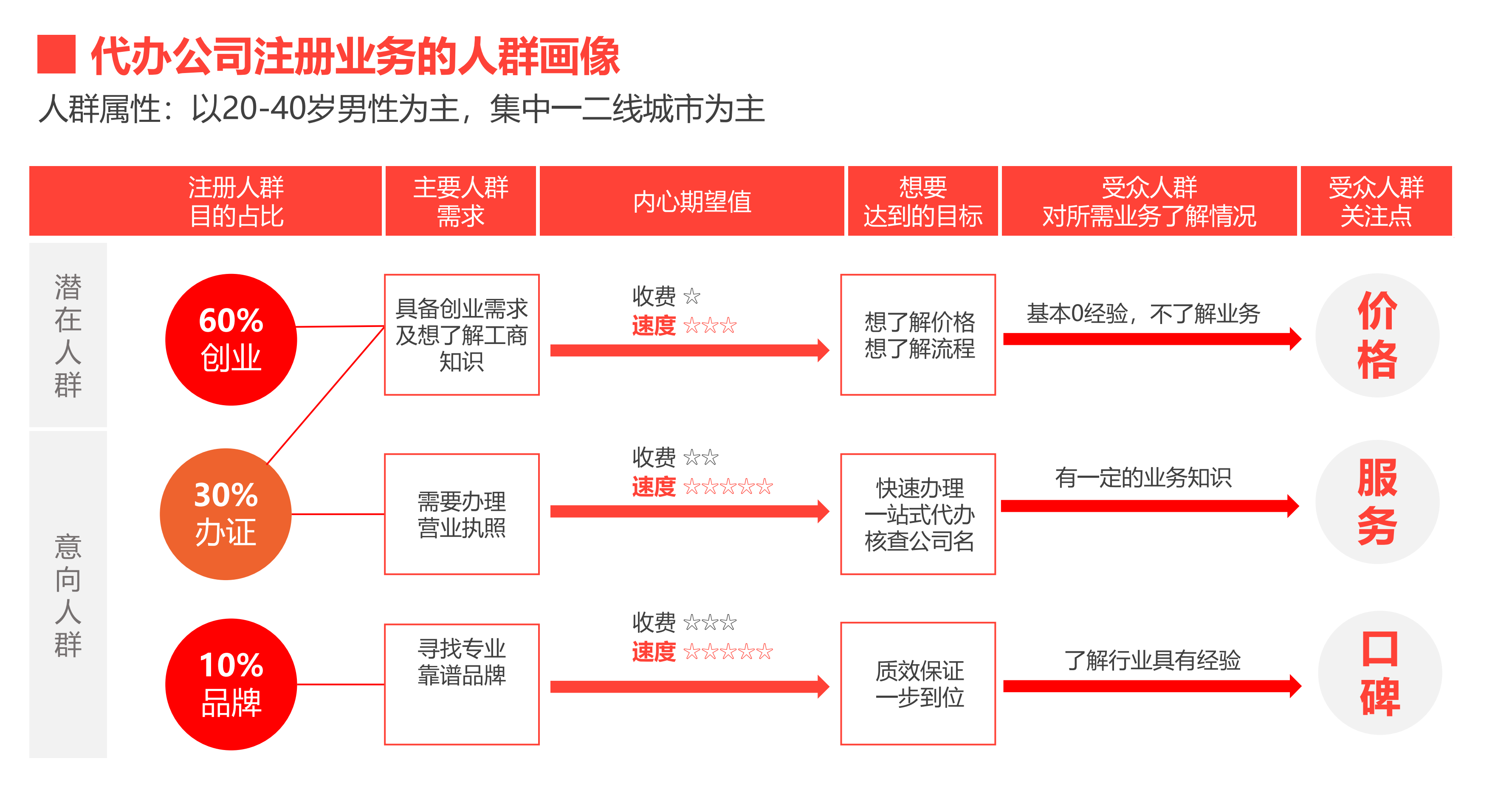 潜在人群:有60%以上主要以创业需求从而对工商知识的了解。以自身实际为出发点,在单页中获取价格与以及办理流程。