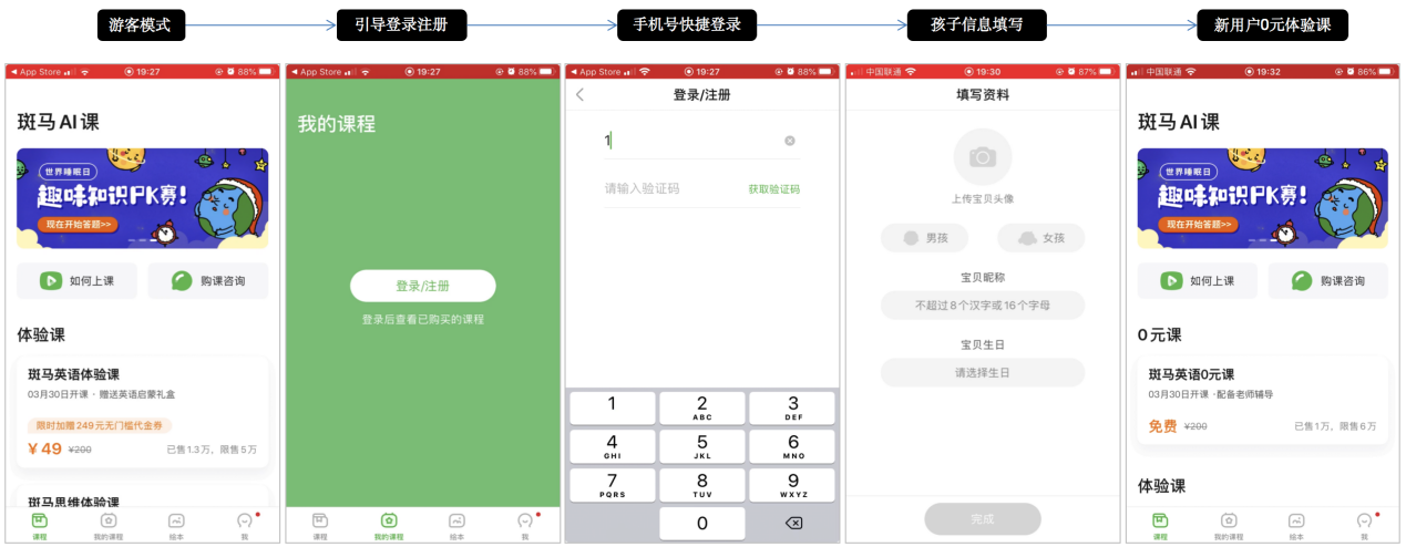 在游客模式下,用户可以不用注册,直接体验工具部分的模块和活动内容。即绘本tab下的斑马FM、斑马看世界、斑马绘本。与其他产品如叽里呱啦,在启动页之后进行手机号拦截的不同在于,这种方式一方面可以让用户先感受到产品的价值,从而主动进行手机号的注册。另外一方面,斑马并没有采用电销模式,可能就未强制获取手机号。