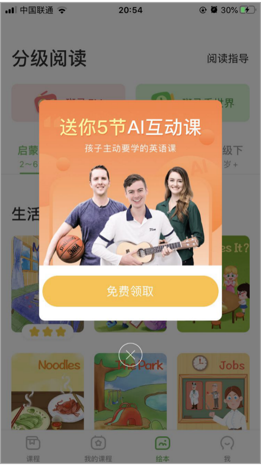 信息填写完成在首页中就会出现0元课,引导用户进行体验。在这一环节的设计上,斑马并没有采用弹窗等比较明显的方式,而是在原本低价课区域多出0元课。应该是为了避免对用户进行过多的干扰。但在绘本模块下,如果用户在未领取0元课之前,每完成一个绘本的学习后会出现免费赠课弹窗(如下图),既达到了营销的目标,也让用户感受是学习后收到一个礼物而不是打扰。