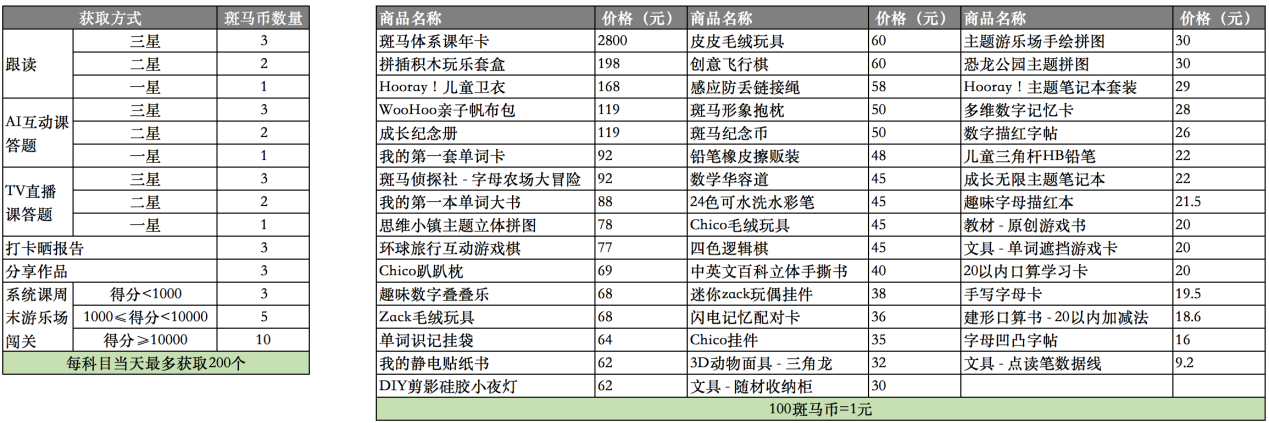 在外因上:激励+提醒机制。在激励用户留存上,斑马也采用了常用的PBL机制。这套“斑马币”配合商城的玩法,很受孩子和家长的欢迎。很多家长在社交媒体上表示,孩子在答题后收到斑马币很开心,同时为了兑换商城中喜欢的一款玩具也会不停的去收集斑马币,斑马币的获取规则及兑换方式: