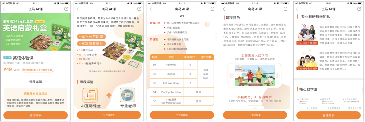 转化上,斑马采用的是试体验模式:“AI课程(工具) + 群服务”,app承担更多的为转化入口和工具。因为用户较少会直接在app下单2800的年课,而是经过低价体验课之后再从app中下单,所以app比较重要的是低价课的设计。那我们来看看,它是如何设计课程落地页,打动用户进行购买和体验的。