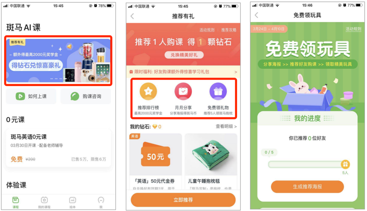用户愿意向身边的朋友去介绍和传播你的产品,是对产品最大的认可。以课程和群服务为主的斑马,在传播上更多的依靠群服务环节,所以在app产品内引导用户传播的方式相对较少,主要体现在两个环节: