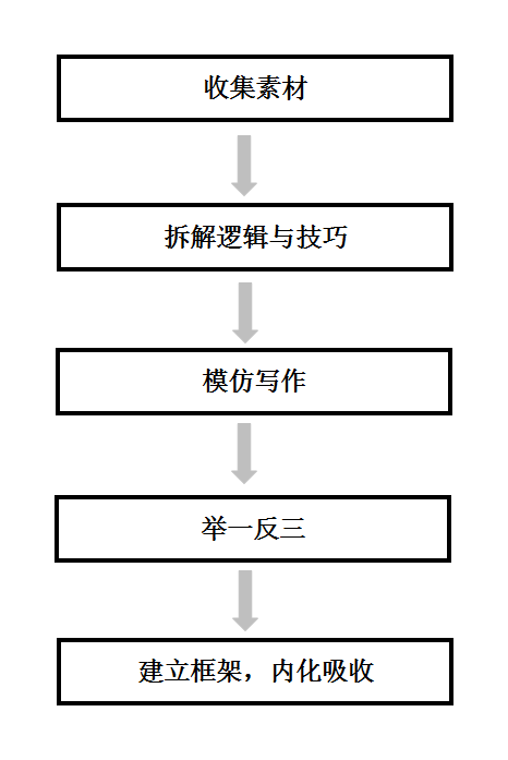 收集素材 ——> 拆解逻辑与技巧 ——> 模仿写作 ——> 举一反三 ——> 建立框架,内化吸收。