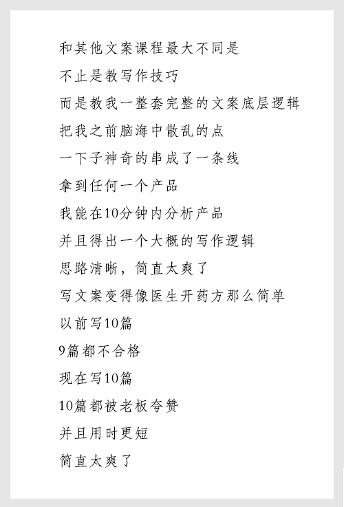 比如文案课程,我们就套用上面的过滤网的写作逻辑来写一篇文案;