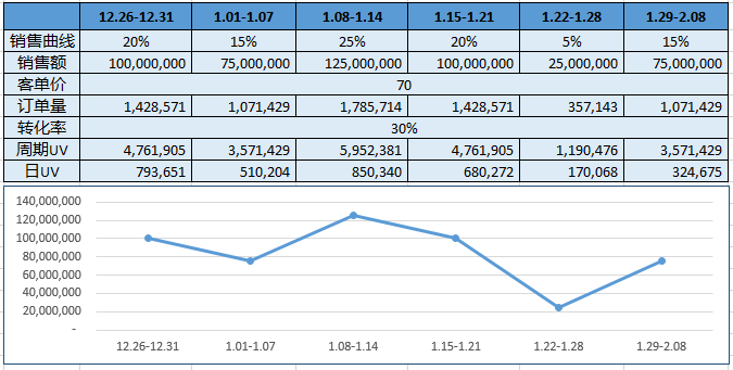 平均UV指标设定:根据最近3个月的历史表现,我们把转化率和客单价做为公式定量,UV则作为变量。这里假设,日常转化率30%,客单价70。则销售额的公式拆解为:5亿=UV*30%*70,则UV=2300万,年货节通常45天,则周期内均值DUV需要到53万。