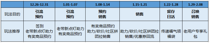 - 预约期更多的目的在于预约和引流,所以这个阶段老带新/新来新的引流玩法会做为主推,点灯助力,传递助力,拼单奖励,包括腾讯的社交立减金都属于强引流玩法。