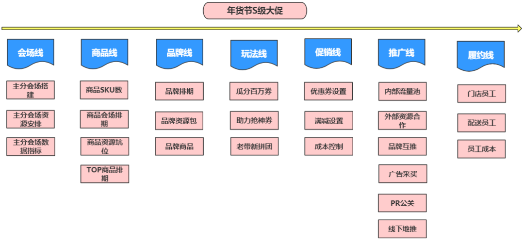 销售预算的拆解和资源盘点,到了这个阶段我们整体的大促方案已经趋于完善,接下来需要把方案落地并开始介入产品线/商品线/资源线等跨部门沟通建立项目执行Timeline!