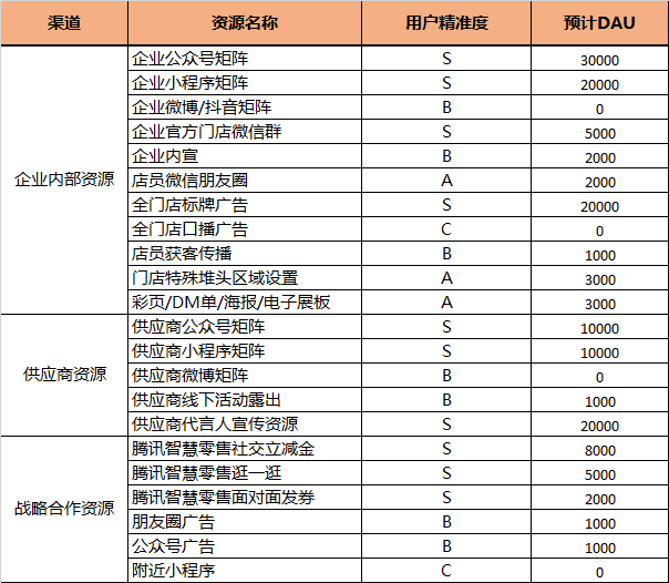 推广资源是我们在做活动内消耗费用的大头,毛利空间有限,给到我们“烧钱买用户”的可能性很小。因此我们需要在这个阶段把压力平摊到几个部分的公共资源内。企业内部资源,供应商资源,腾讯智慧零售战略级资源等等。宣传推广的资源不在于多,而在于精准。对于用户跳转路径和用户属性,我们不妨把所有宣传资源拆分成SABC四个档位,每个渠道增加埋点追踪,同时重点监控S和A的流量走势。