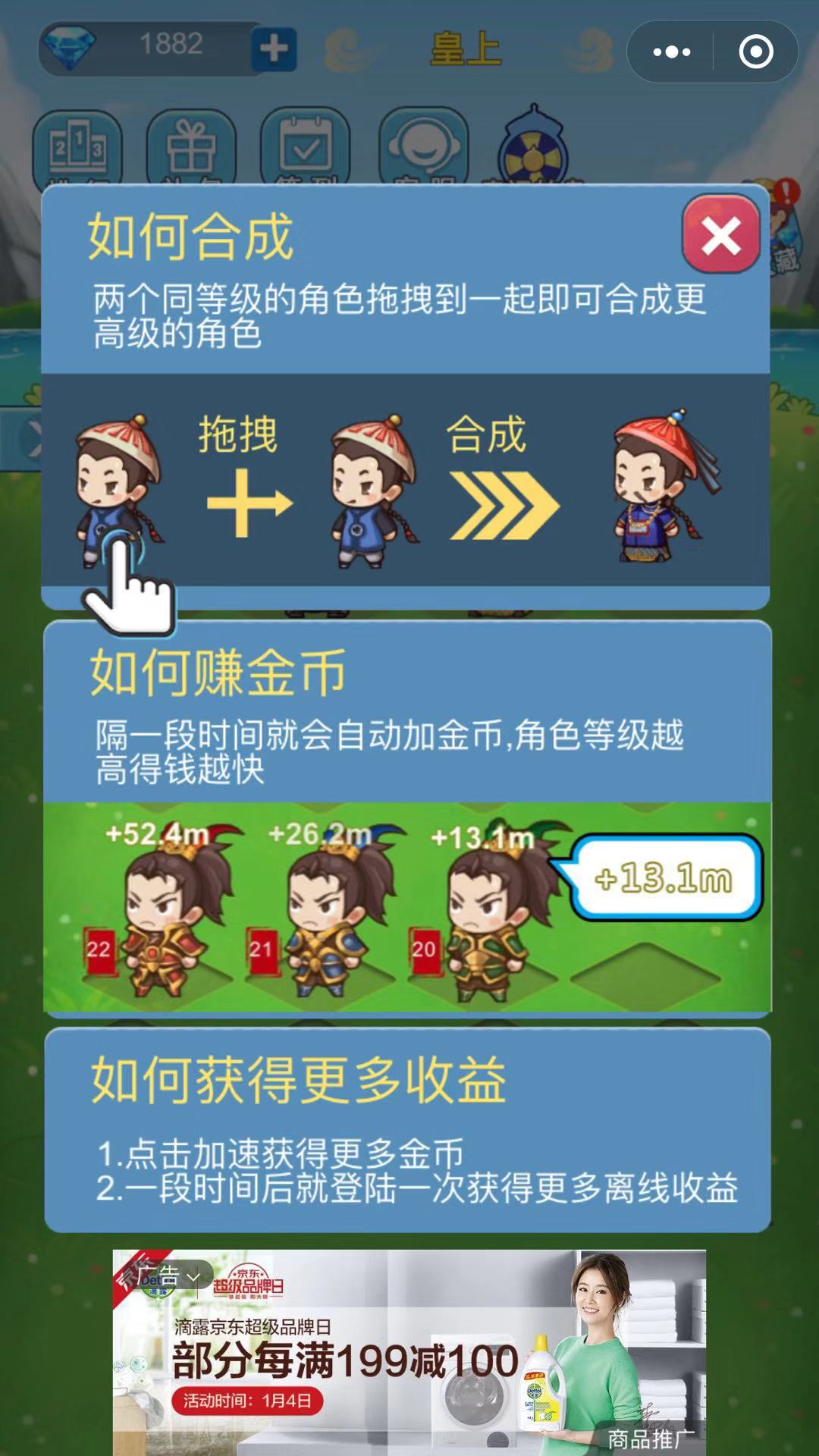 它靠着可爱又简洁的画风,威严又神秘的宫廷背景吸引各路玩家用户,抓住了用户的猎奇、炫耀心理,借助微信平台,充分利用好友关系,玩起了微信裂变增长,用户只需要分享、看广告、简单的买买买就能逐步晋升为皇。