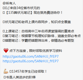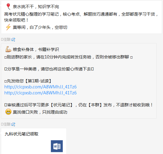 有新人进群机器人就会自动提示,平常不间断推送其他营销形式的活动,比如高中数学学习礼包、《学霸必会知识点高分冲刺课》、英语作文提分、高中生学习资料领取163(QQ群)。不想领取状元笔记礼包的,看到其他礼包、资料、实体书的就可以参与其他活动,增加粉丝利用率,充分的洗粉丝。