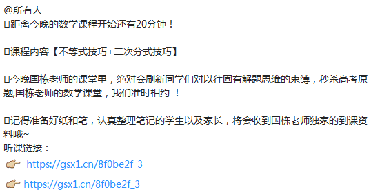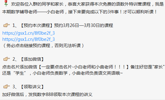 这个模式采用的是直播课的方式,以数学和英语两科为主,抢分营模式采用的是按年级进群,预约听课,添加老师领取资料的运营模式。进群后老师会通知你以下三个事项,首先需要点击链接预约课程,而后引导添加微信领取讲义。