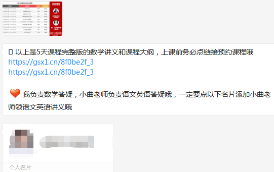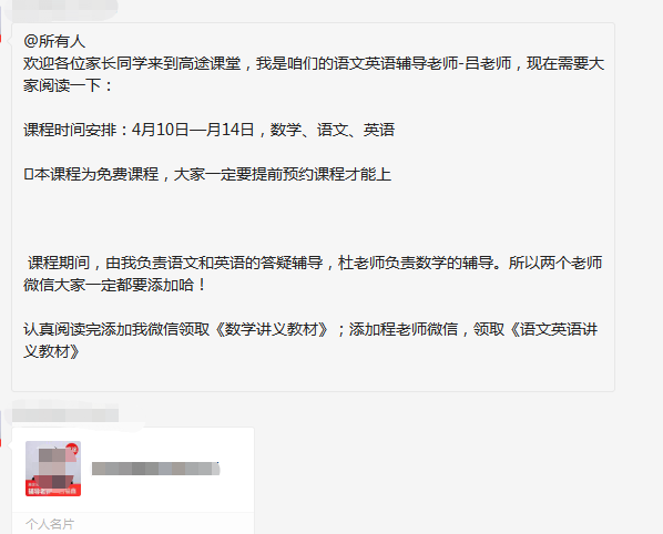 在这个部分作为训练营运营模式中的开课前的前端,个人号起到了很大的增加信任感的功能与督学的功能,高途还加入了一个分科导流的模式,添加其他科目的老师领取讲义与答疑,把一个用户引导到所有科目类别。然后每个科目的老师,再逐步跟进各科用户需求,进行针对性的跟单成交,但从话术上来看都是通过社群运营和群发优惠进行转化。