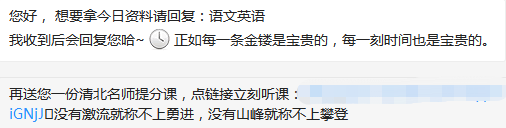 添加好友后,赠送试听课程与语文英语资料,增加用户好感与信任度。而后填写信息,进入群内进行听课,这也是从其他广告营销群,导流至听课群。进行训练营模式的转化。和上文介绍到的一样。