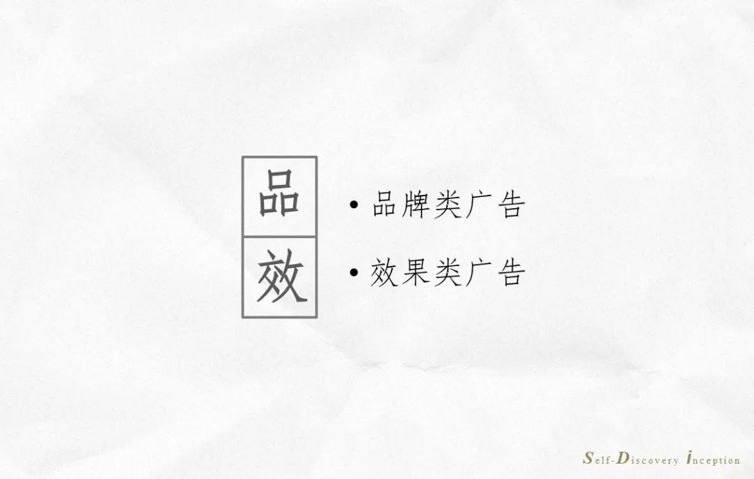 从这种基础理解出发,我们很容易联想到不同的广告诉求。比如,有一类广告是侧重于影响受众认知的,另一类是侧重于影响受众行为的;在营销中,大家常常会以“品”“效”二字来指代这两类诉求,这也就是今天行业中频繁讨论到的,品牌类广告和效果类广告。