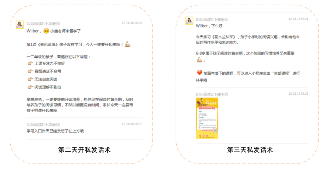 2、免费服务期间,干货分享环节和阅读这个方向强相关,且围绕家长痛点进行,有很扎实的内容,会通过各种数据强调专业性;转化期间,营销物料种类与形式非常多样,视频、海报、语音,并且会结合场景使用各种不同话术。
