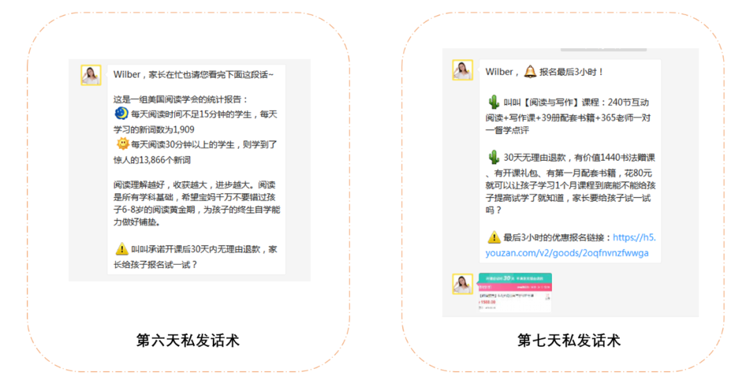 1、免费服务期间,更加强调课程价值及干货,全程无任何营销卖课内容,提升家长体验。转化期间疯狂营销,短时间内进行强转化(营销高峰期一天会在群内发11次推课信息);