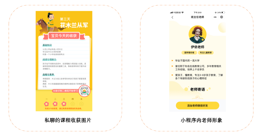 1)老师形象突出:头像、自我介绍 + 真人语音(关怀)+ 同步在小程序展示老师形象