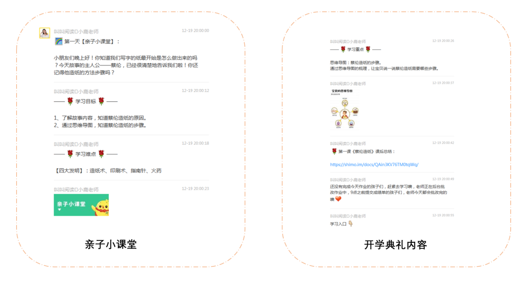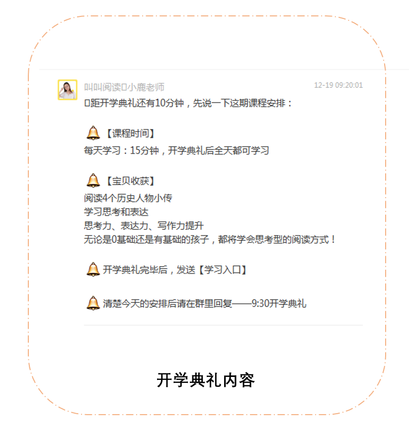 1)开学典礼前,要求用户刷屏回复“9:30开学典礼”,可以让没有打开群的家长也在聊天列表中获取相关信息,引导家长进群查看;