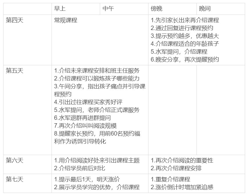 后期集中转化的环节,建立在家长前期的体验感上。通过3-4天的课程体验,以及过程中对家长的强运营,让家长认可课程价值。并通过各种营销策略,促使家长决策。