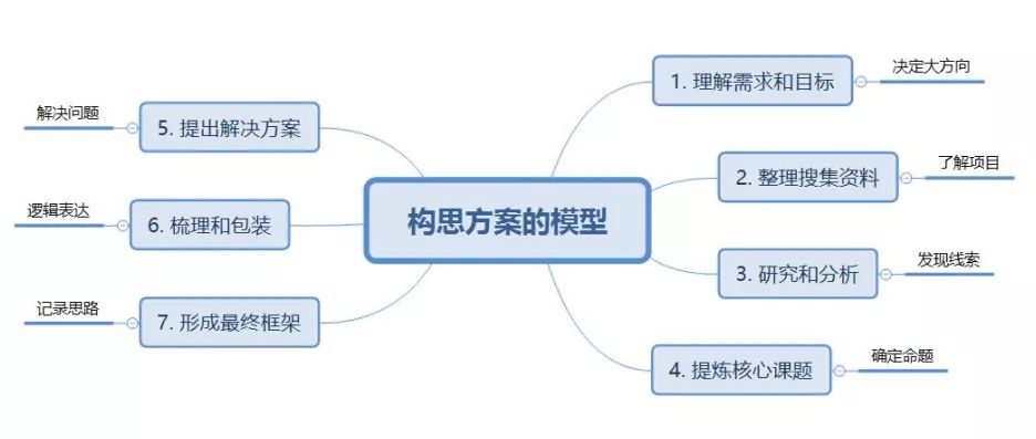 为了帮助大家摆脱写方案没思路的困扰,我和几位资深营销策划师进行了交流和探讨,把这些年写方案的方法做了一个总结,提炼出一套构思框架的万能套路,大致可以分为七个步骤: