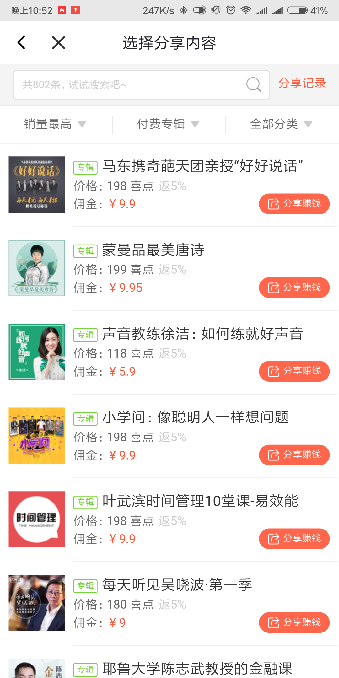 喜马拉雅的分享返利功能设计较为保守,返佣的金额上较低,而且没有设计分销相关的体系。在合适的爆品上加上高反和分销的收益叠加,很容易刷屏,同时也很容易被封禁。