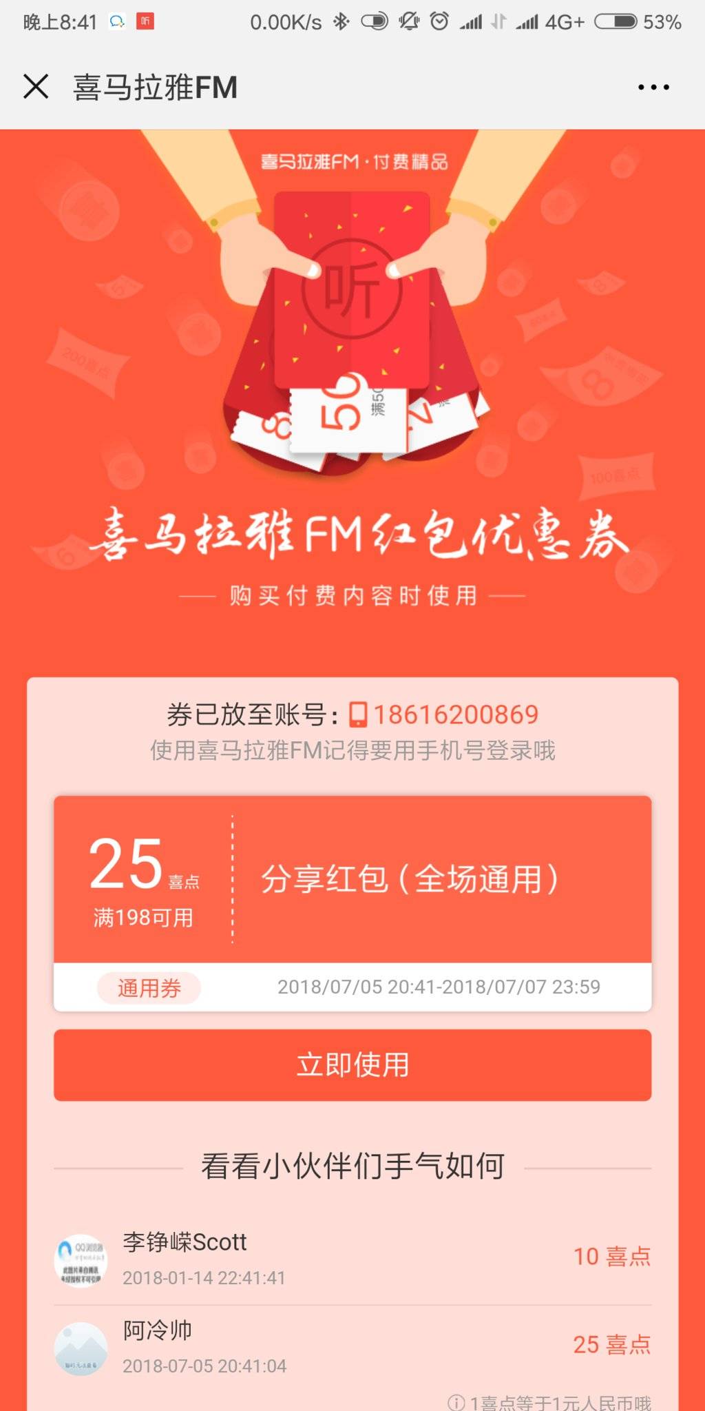 而上图实例中的付费节目消费红包相对使用场景较少,所以在某个群里待了半年直到我去搜索喜马拉雅才再次被人打开。分裂红包玩法在设计的时候需要关联上某个场景,比如将某个明星的独家私密内容加入到宣传红包的可使用对象中,用户了解自己领了这个红包可以去消费某个自己感兴趣的内容才能真的促进拉新和使用。