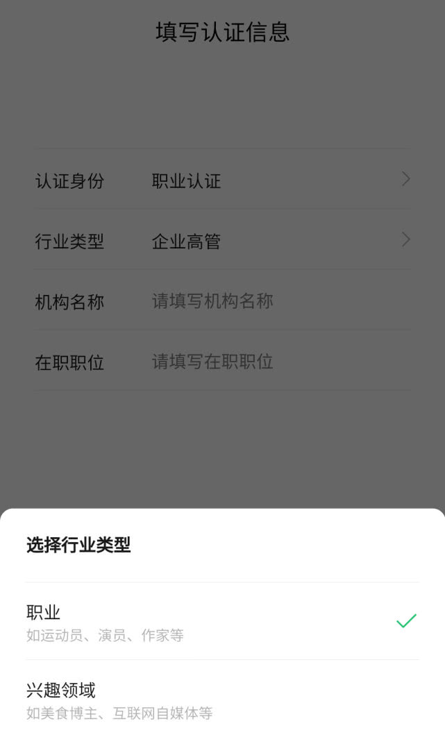 - 职业领域:用户选择职业认证,可以使自身形象更为突出,标识更加鲜明醒目,可以提高其他用户对其信任度,有利于用户更好的持续输出内容。