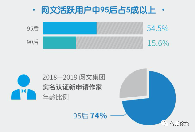 网络文学在题材及用户审美的多元化表现十分显著,这也与Z世代的审美特征相匹配,据《2019年度网络文学发展报告》数据,54.5%的网文活跃用户为95后,而阅文集团2019年新增作家群体中,95后作家占比超七成。