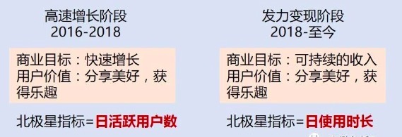 回到抖音的北极星指标,其实日活跃用户数和日使用时长两指标存在相关性,但是在互联网人口红利殆尽、抖音日活几近饱和的情况下,后者比前者更能反映用户价值,所以在加速变现的现阶段,抖音的北极星指标为日使用时长。