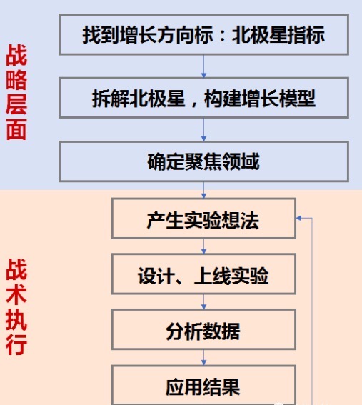 首先是战略制定阶段,从寻找北极星指标开始,将北极星指标拆解成细分指标,并找到目前对目标影响最大的、要聚焦的领域。然后就是针对聚焦领域进入战术执行阶段,在聚焦领域找到突破点,产生一系列实验方向和想法,进入快速实验迭代的阶段,设计、上线实验,并分析数据结果,将结果运用到下一个实验,并在过程中实时监测指标的变化。