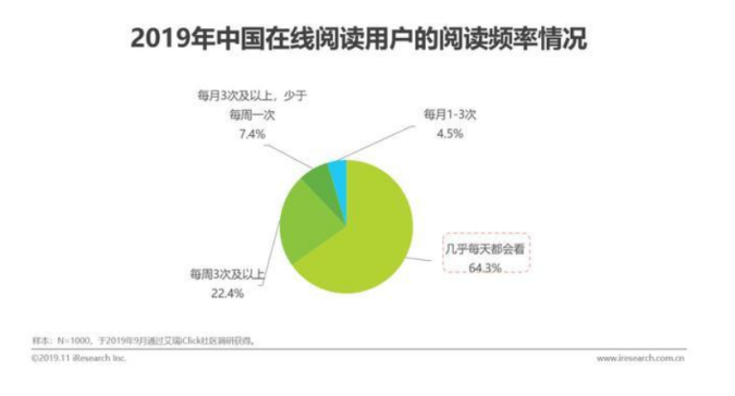 根据2019艾瑞咨询在线阅读行业报告,有关阅读频率情况,
