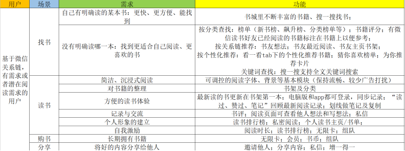 根据微信读书目前主要满足的需求和功能点设计来看,在帮助没有明确读哪一本书的用户找到适合自己的书籍着墨较多,重点在于内容体系的搭建。笔者认为可能是微信读书看到了内容营销后续对商业化盈利的价值重要性;同时页面简洁,良好的用户体验与微信关系链是其亮点优势。