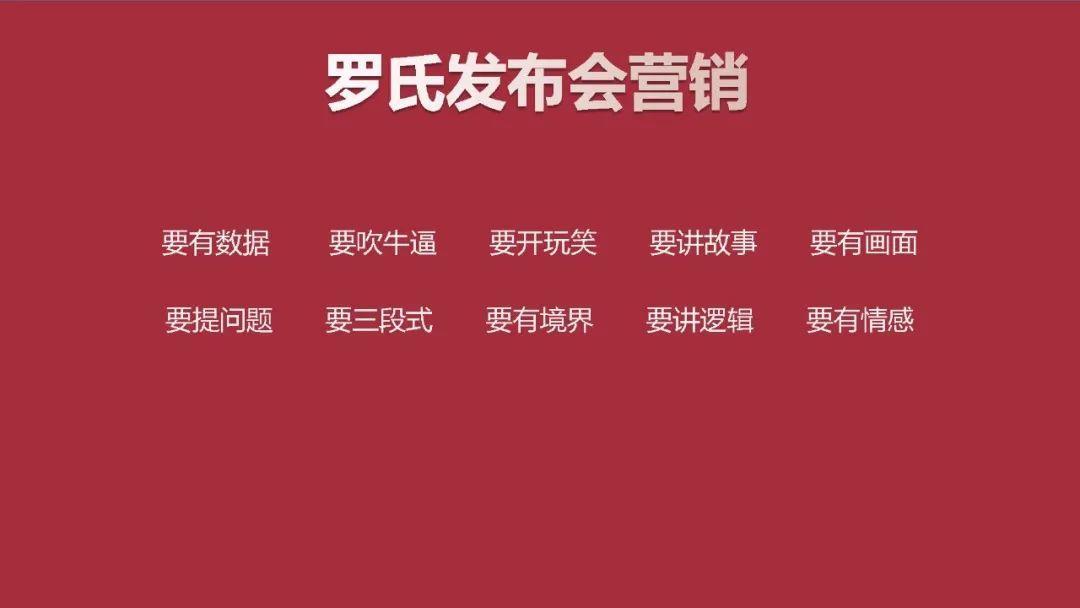 后来老罗也对自己的发布会中演讲的一些东西做了总结,他说发布会营销要干嘛?要有数据、要吹牛逼、要开玩笑、要讲故事、要有画面、要提问题、要三段式、要有境界、要讲逻辑、要讲情感,大家可以自行参考和借鉴。
