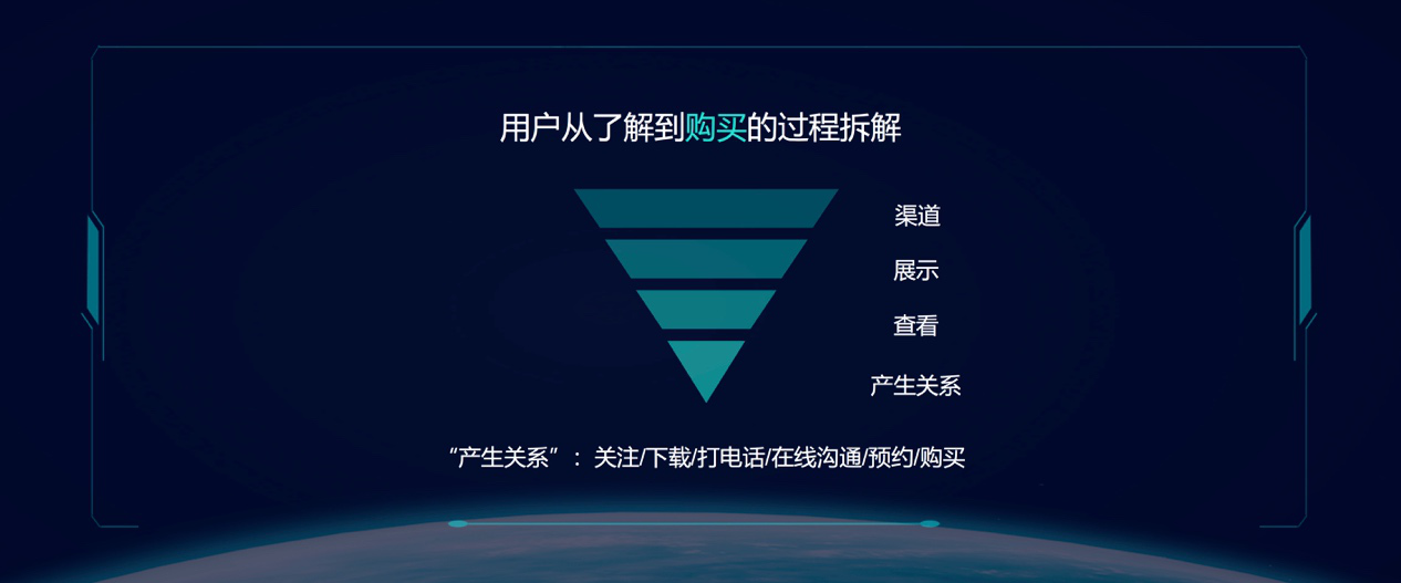 我们来拆解一下,首先通过某一个渠道,无论线下还是线上,把你的广告展示出来,用户看到了可能会查看、点击,然后看到设计好的页面,如果用户觉得OK就会跟你发生关系。
