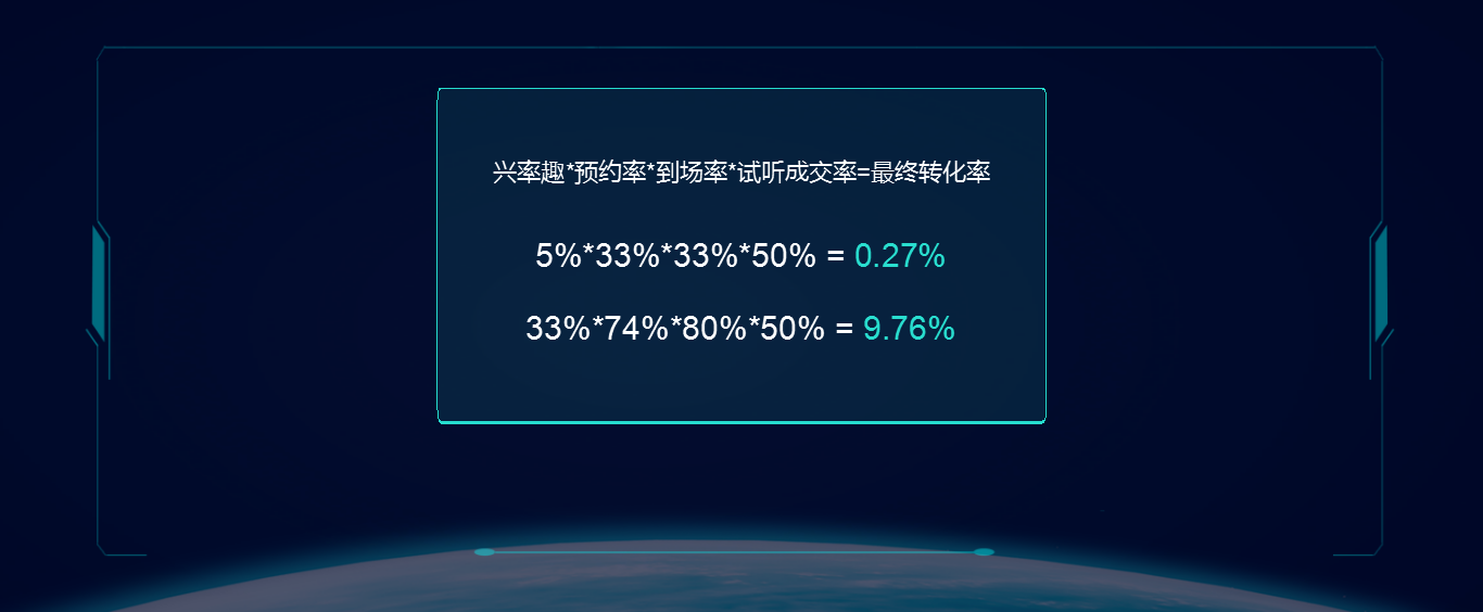 首先投放带来用户看到页面,有33%的人会发起在线咨询、填表单或打电话咨询,然后优化话术,让预约率从原先的33%提升到74%,然后通过流程改造,让到场率从33%提升到80%,最后一步试听课没法优化,是受线下试听课老师影响的,所以还是50%左右。