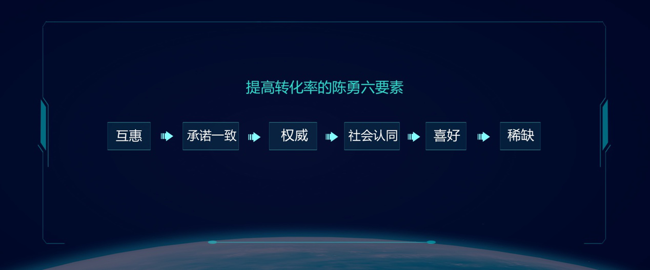 陈勇六要素的六个要素分别什么用呢?互惠可以激发兴趣,承诺一致可以产生轻度信任,权威产生信任传递,社会认同产生从众心理,喜好远离痛苦,最后用稀缺让用户着急,这是一个让客户下单的模型。