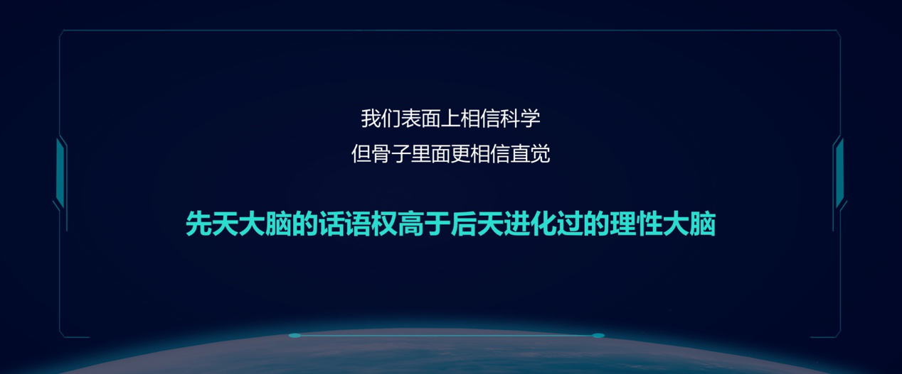 为什么这个广告反而有人不信了呢?原因很简单,你要想想看这个广告的过程中,你的大脑在思考什么?我们平常表面上相信科学,我们骨子里面更相信直觉,就是因为先天大脑的话语权高于后天进化过的理性大脑。