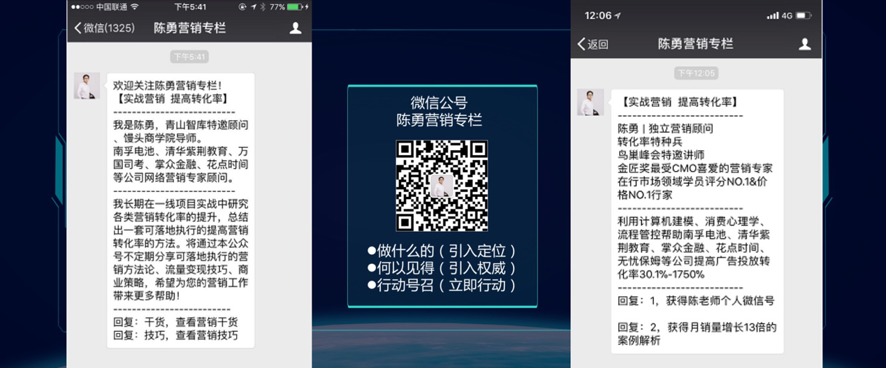 很多人写公众号,问怎么用陈勇六要素?其实也很简单,首先讲公众号做什么,引入定位,第二怎么证明你很牛的样子,引入权威,然后给个行动号召立马让他去动起来。