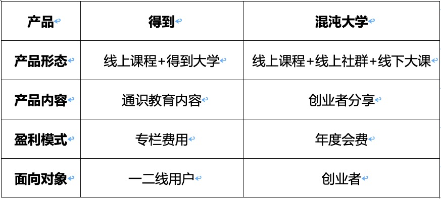 「得到」通过对专栏的打磨,从《薛兆丰的北大经济学课》开始,逐渐确立了一种知识精英在互联网时代打破围墙的概念,后续得到大学限定人数、少年得到的内容制作,都是沿袭着一种精英的气息;「混沌大学」定位于创业者则更加小众,所以混沌大学更偏重于线下大课和线上社群,因为社交属性对于创业者来说更具吸引力。