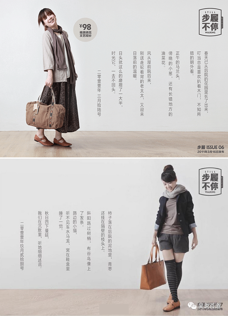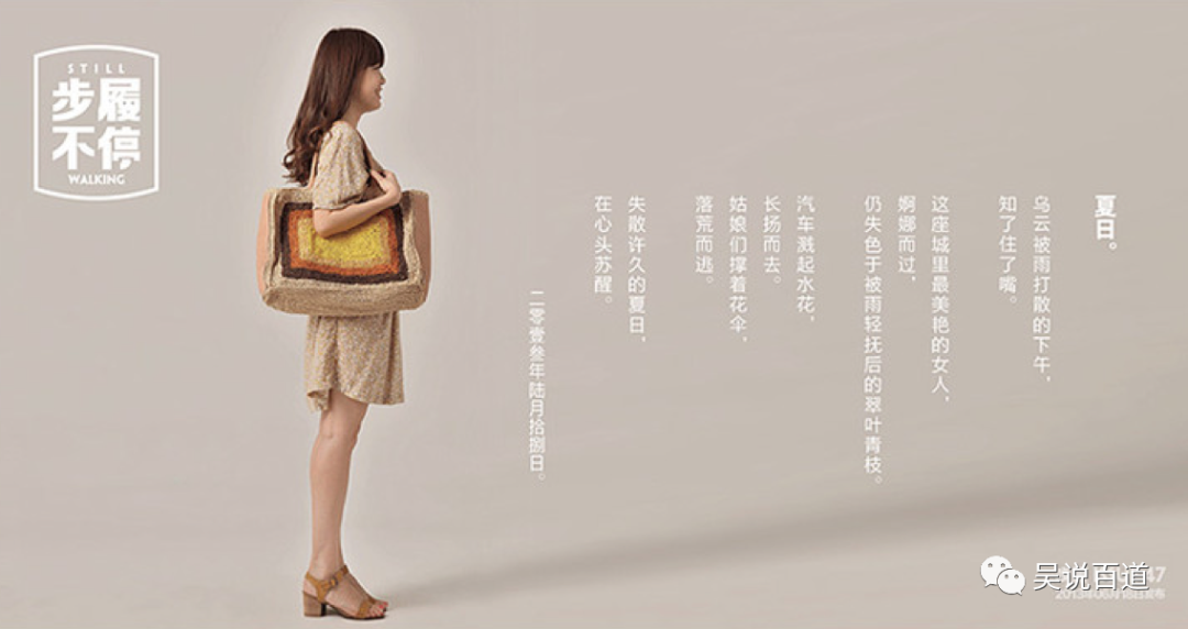例如,“步履不停”服装品牌,它尤为善于塑造“具体”。像在季节系列中,它根据不同季节,筛选最具代表性的意象,糅合精准的动词,加以描绘,画面自然凸显。