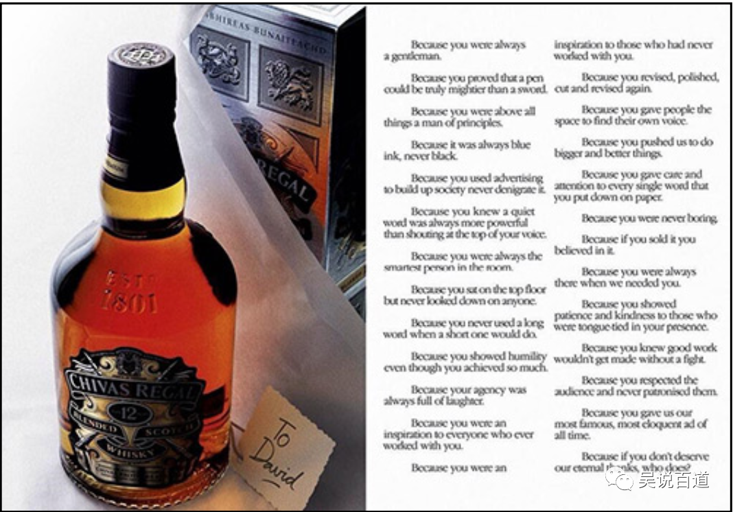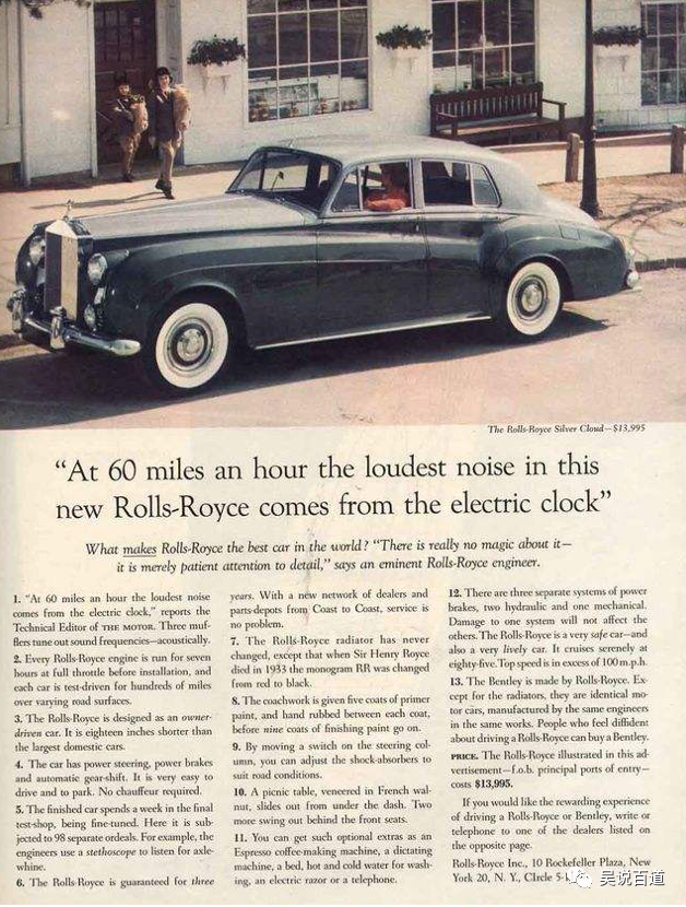 还有奥格威操刀的劳斯莱斯文案——“这辆新型‘劳斯莱斯”在时速六十英里时,最大闹声是来自电钟”