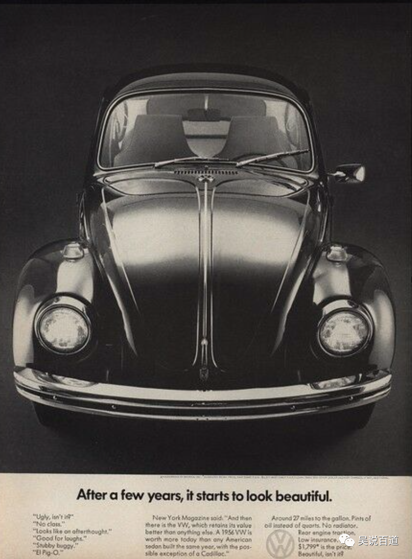 50年代,由于报刊媒介的特点,美国涌现了大量反差故事广告,甲壳虫和苹果就是其中的佼佼者。