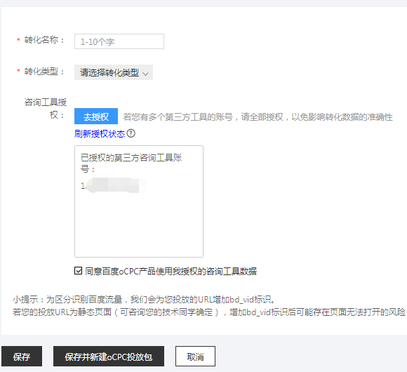 先填写名称,下面是转化类型,包括:一句话咨询、三句话咨询、留线索。量大的行业可以选择三句话或者留线索,量少的行业建议先一句话咨询;
