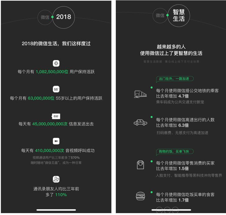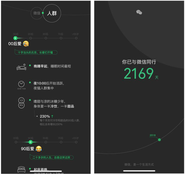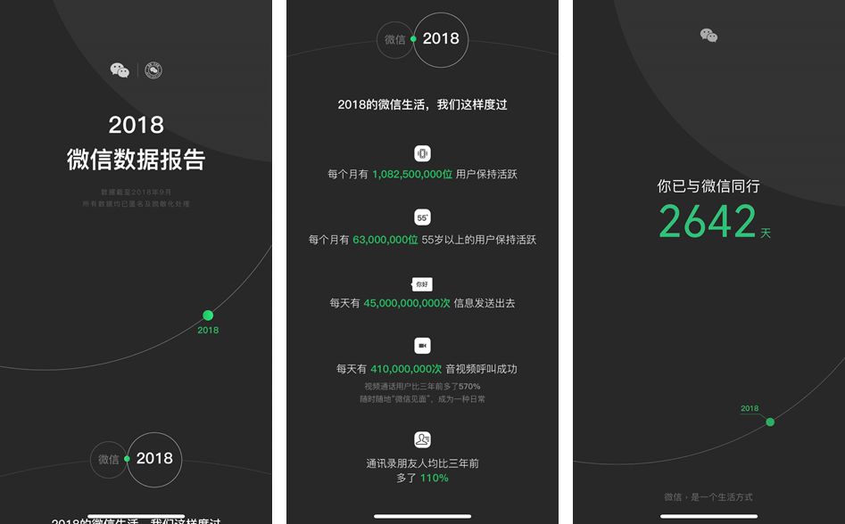 这三种数据类型可以混合使用,比如昨天的《2018 腾讯数据报告》就混合了 3 种类型:用户数据和智慧生活是产品数据,人群表情包用户习惯是报告数据,最后的“与微信同行 n 天”是用户型。